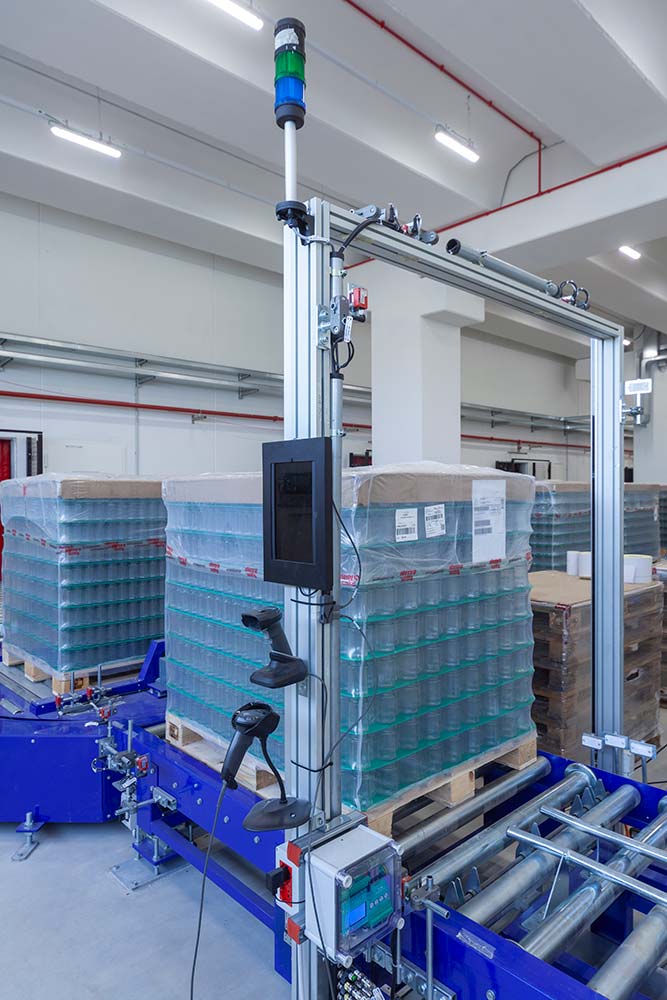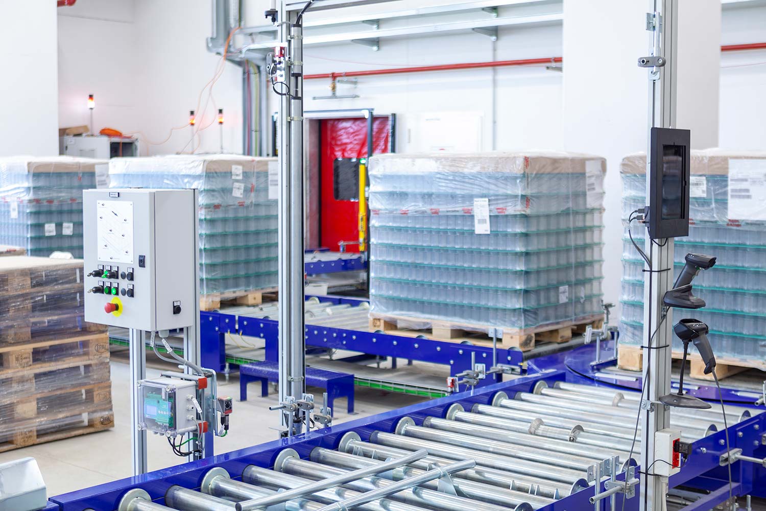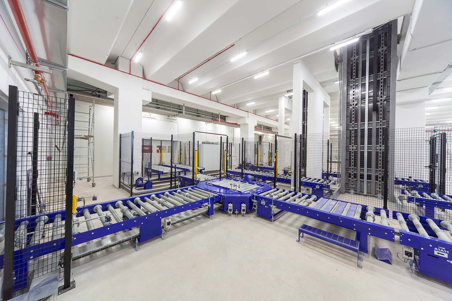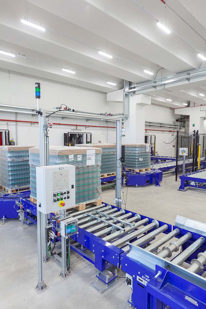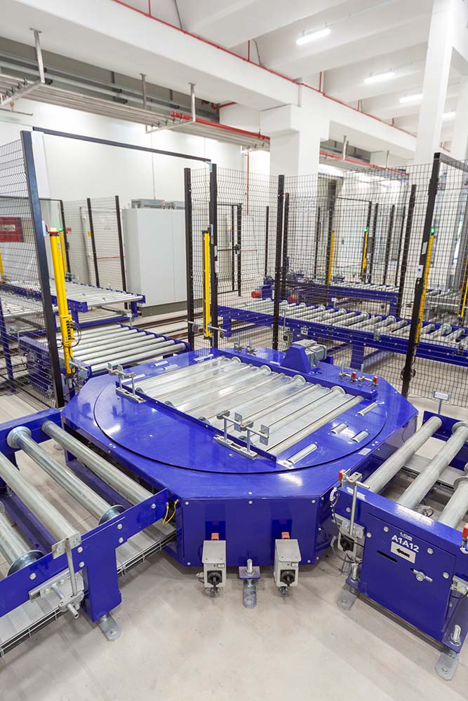 Material handling system: weight and dimension control upon entry, roller/chain conveyors, lifting and rotating tables for pallet deviation, elevators, and sorting shuttles.