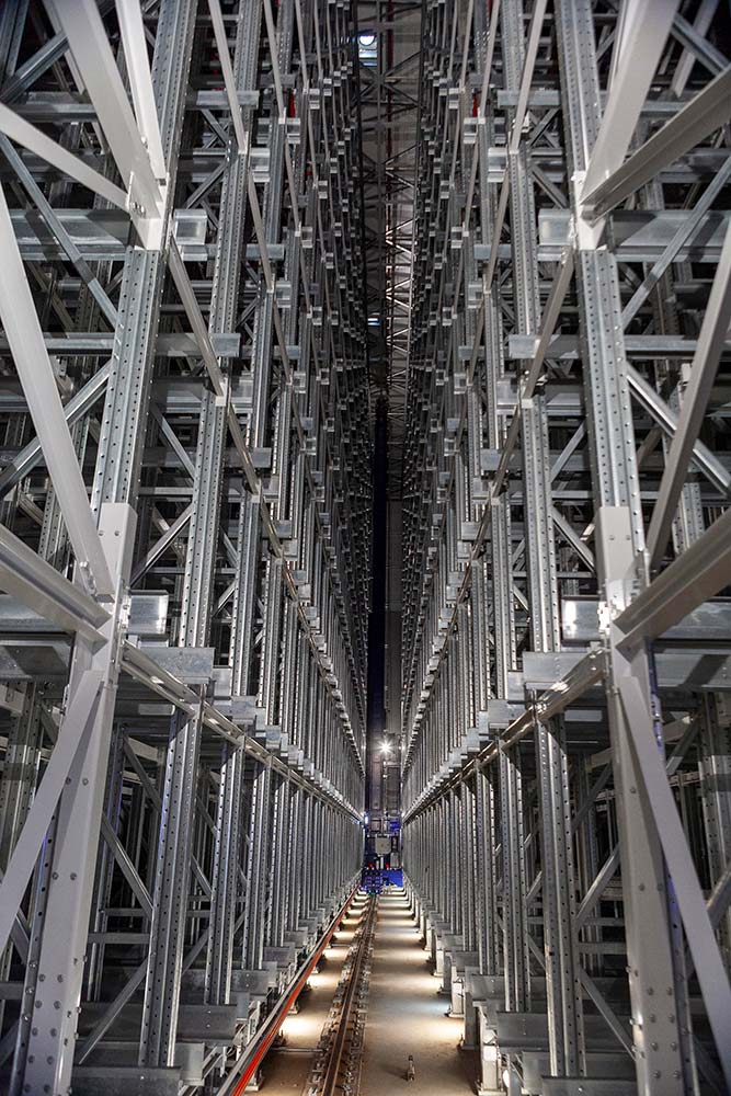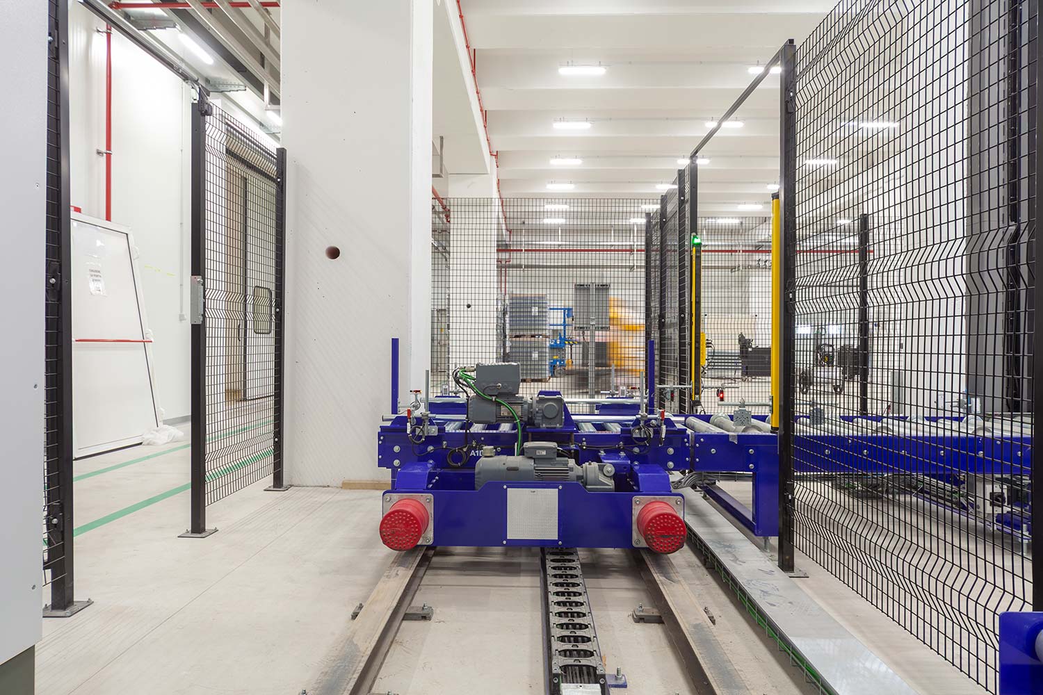 In addition to significantly reducing floor storage space, the solution needed to efficiently and automatically feed production lines located on two floors while reducing crossing times.