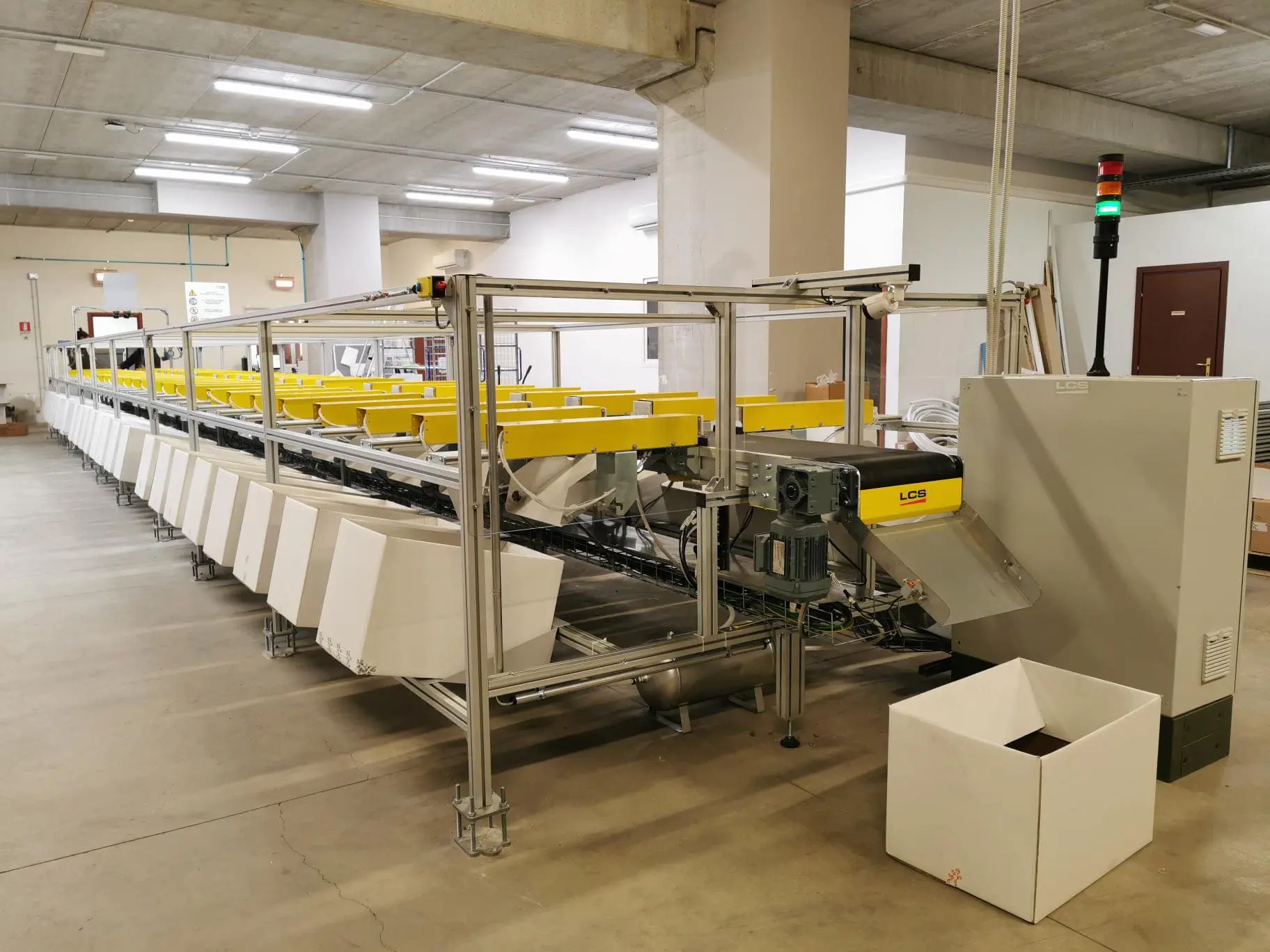 La soluzione ideata da LCS si basa su un sistema di smistamento automatico ad alta efficienza, al centro del quale si trova un sorter configurato per identificare e suddividere automaticamente i prodotti in arrivo. Gli articoli, dotati di etichette con barcode univoci, vengono riconosciuti dal sistema e smistati su 51 differenti scivoli, ciascuno associato a una specifica destinazione logistica: dalla collocazione a magazzino alla preparazione per la vendita online, fino alla spedizione diretta al cliente. Il sistema utilizza spintori pneumatici veloci e precisi, che garantiscono una movimentazione sicura degli articoli senza danneggiarne il contenuto, anche in presenza di imballaggi delicati come quelli degli occhiali.