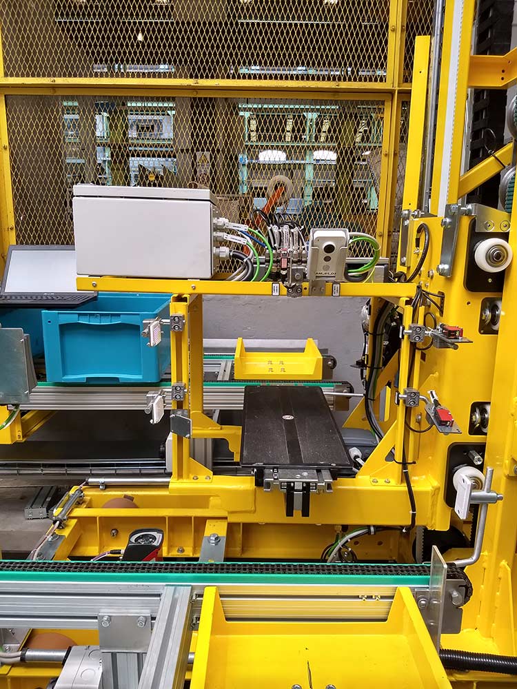 Trasloelevatore: gestione cassette in plastica tramite dispositivo a forca telescopica in semplice prondità