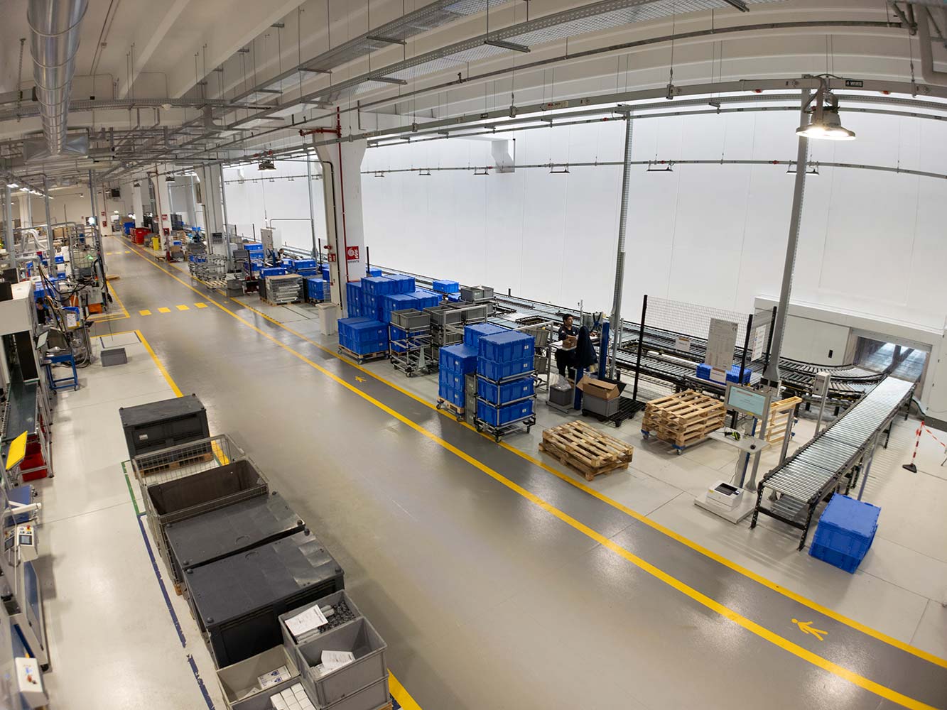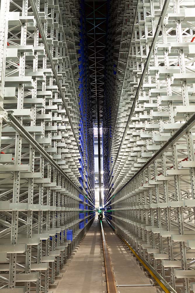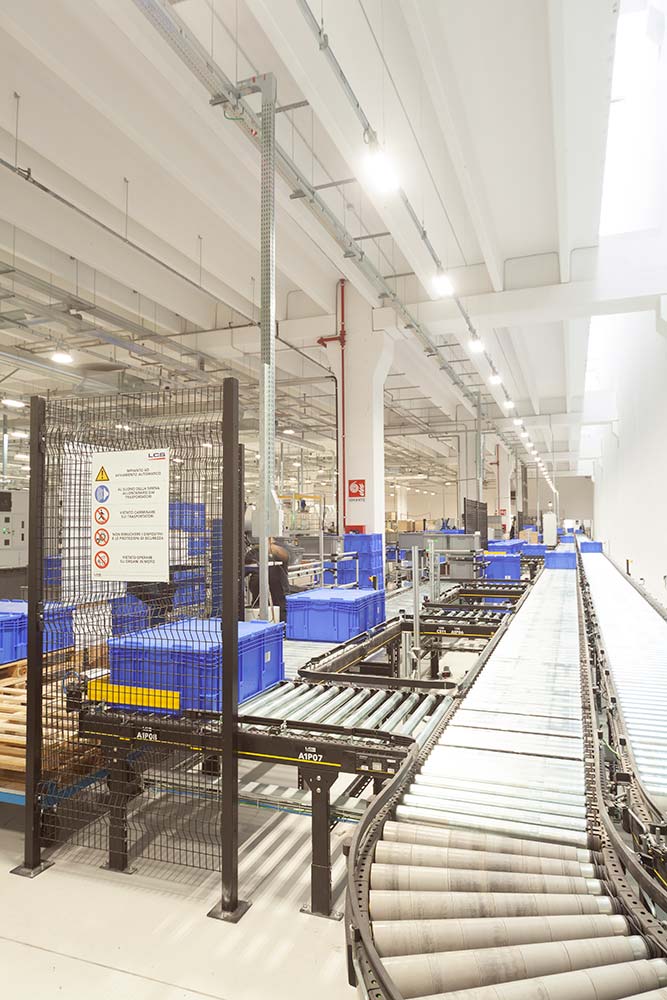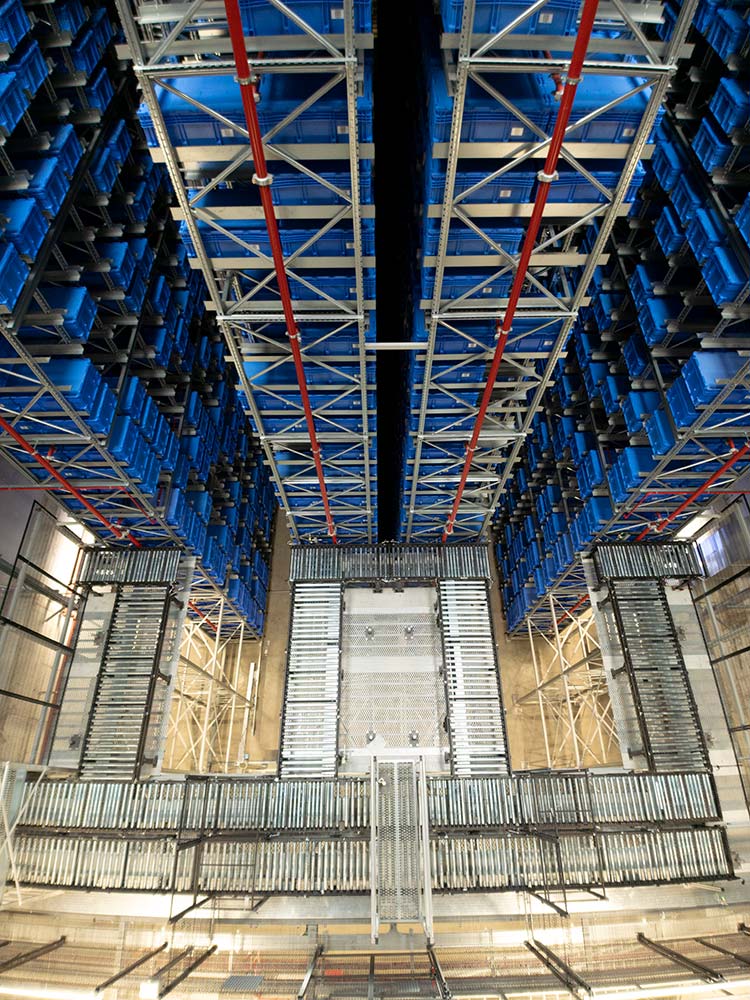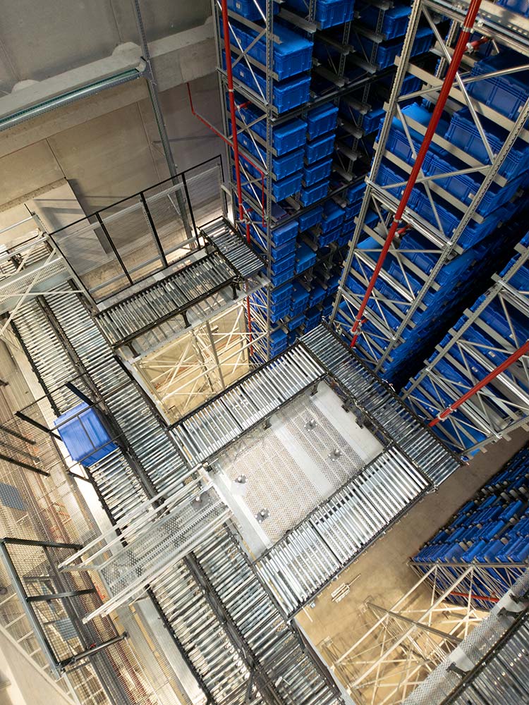 Oltre a ridurre significativamente l’area a terra per lo stoccaggio era necessario alimentare in automatico ed in modo più efficiente e puntuale le linee di produzione poste al primo piano del nuovo edificio tenendo conto dell’espansione verso il secondo piano.