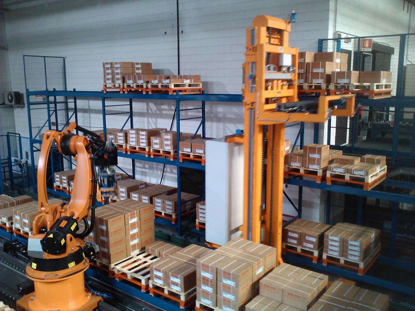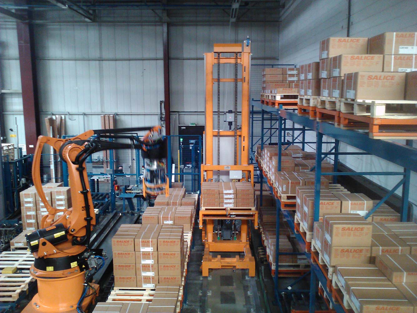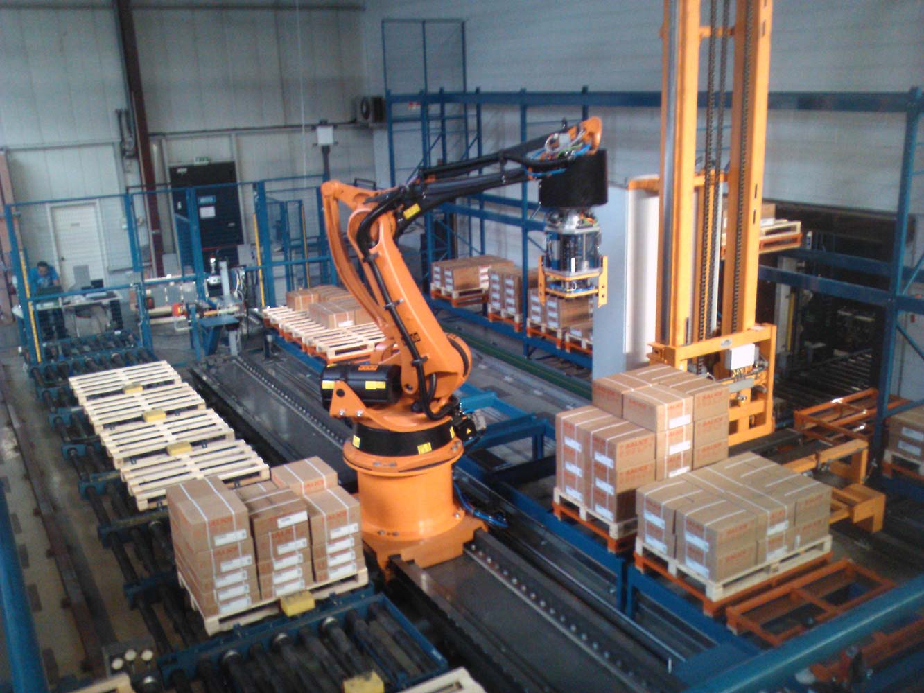 • Robot a 4 assi su unità lineare per prelevare cartoni da un display di 12 pallet pieni e posizionarli su uno dei pallet del cliente